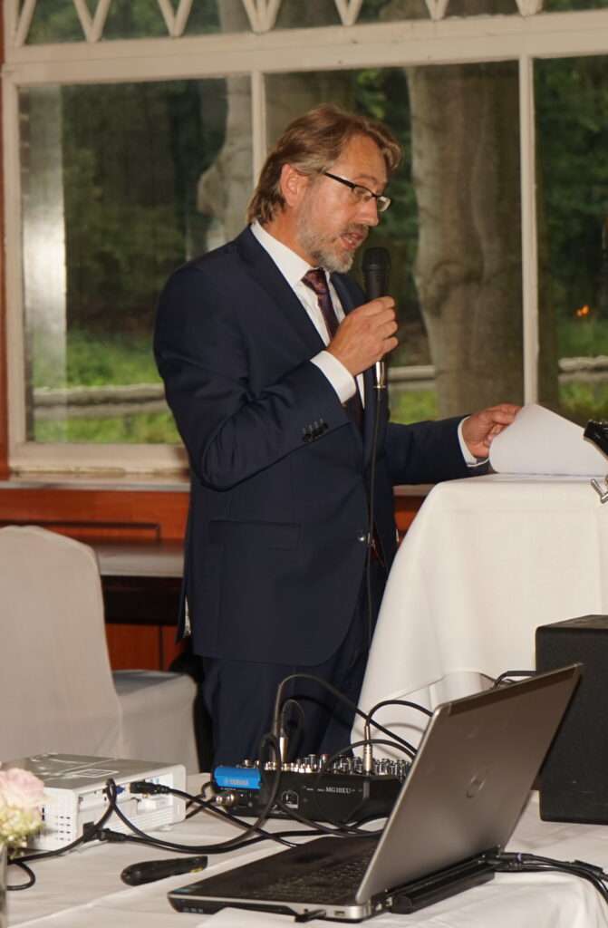 Christophe Lüttmann führte durch das Abendprogramm und kündigte den ersten Redner, Prof. Dr. Max Otte an.